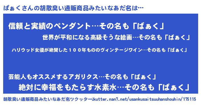 | 意味不明あだ名 | 『住所不定無職ばぁく(10歳)』 |