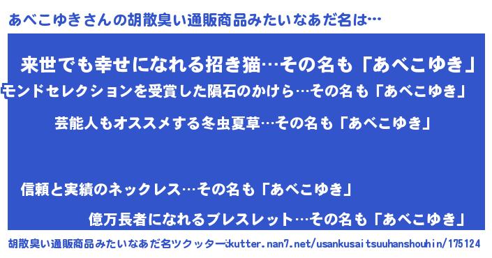 | 意味不明あだ名 | 『自称あべこゆき』『永久保存あべこゆき』 |