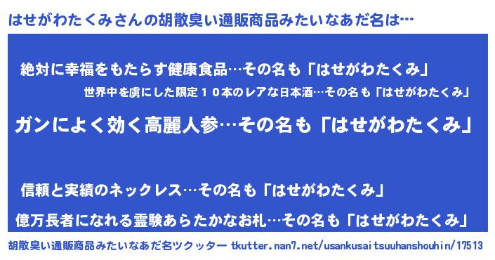 | 意味不明あだ名 | 『めかぶ科はせがわたくみ属』 |