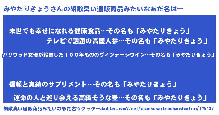 | ヘコむあだ名 | 『みやたりきょう(笑)』『なまこ酢』 |