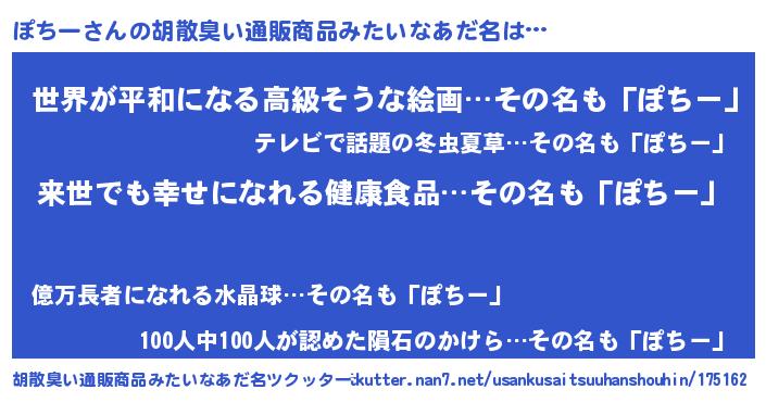 | 男性向けラノベタイトル風あだ名 | 『ぽちーという概念が存在しない退屈な世界 』 |