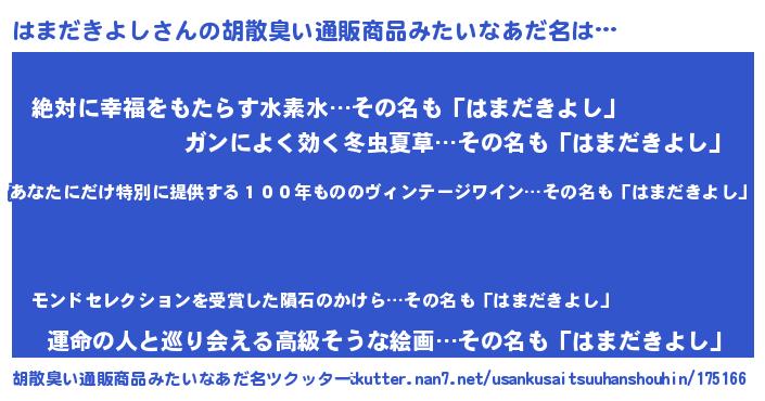 | 意味不明あだ名 | 『住所不定無職はまだきよし(12歳)』 |