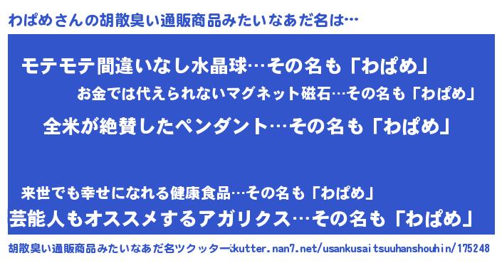 | 意味不明あだ名 | 『とにかく怪しいわぱめ』『自称わぱめ』 |