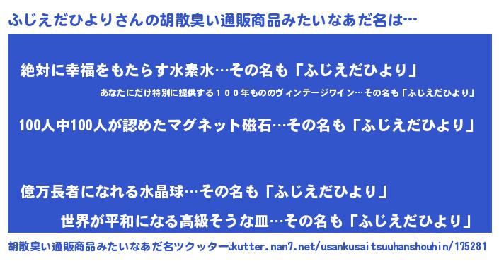 | 男性向けラノベタイトル風あだ名 | 『おまえをオタクにしてやるから、俺をふじえだひよりにしてくれ! 』 |