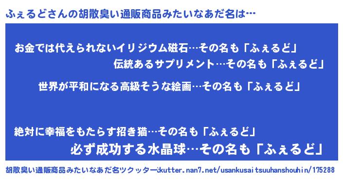 | 女子向けラノベタイトル風あだ名 | 『ふぇるど伯爵の花嫁』『ふぇるど恋絵巻』 |