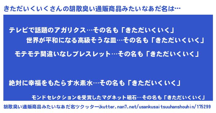 | 女子向けラノベタイトル風あだ名 | 『きただいくいく姫と円卓の騎士』 |