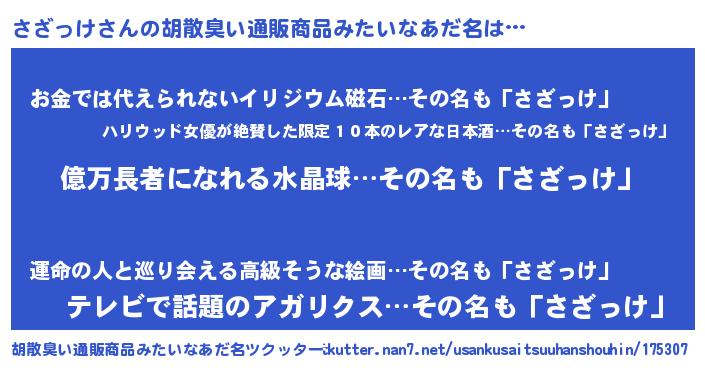 | ヘコむあだ名 | 『さざにゅー』『なまこ酢』『さざを』 |