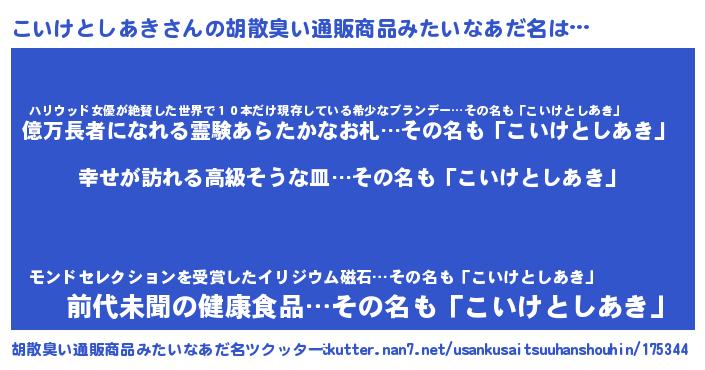 | 女子向けラノベタイトル風あだ名 | 『こいけとしあきの雑貨屋さん』 |