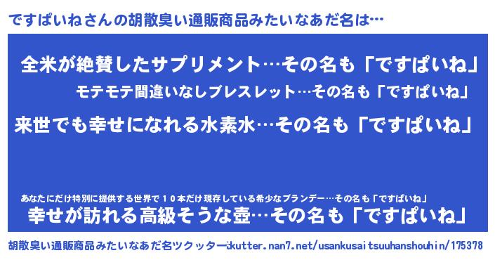 | 男性向けラノベタイトル風あだ名 | 『ですぱいねという概念が存在しない退屈な世界 』 |