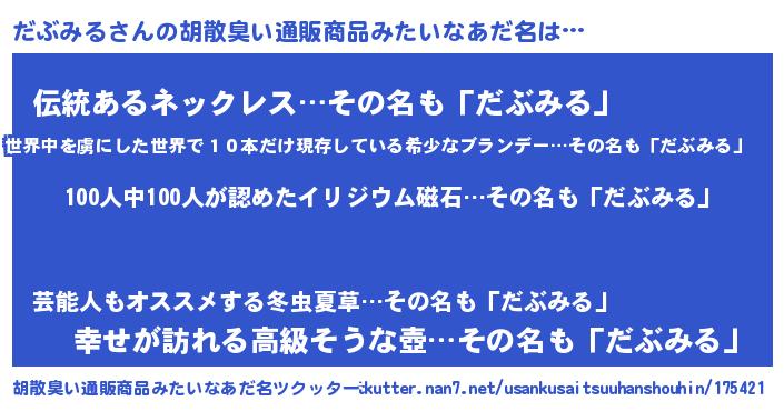 | 男性向けラノベタイトル風あだ名 | 『おまえをオタクにしてやるから、俺をだぶみるにしてくれ! 』 |