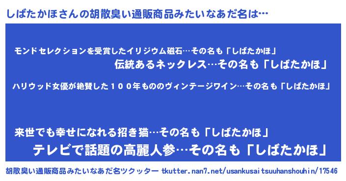 | ヒーロー風カッコイイあだ名 | 『仮面シバダー』『天空の使者しばたかほ』 |