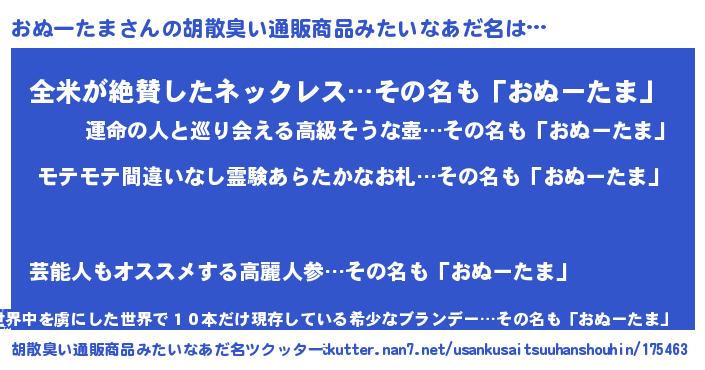 | 男性向けラノベタイトル風あだ名 | 『おぬーたまの憂鬱』 |