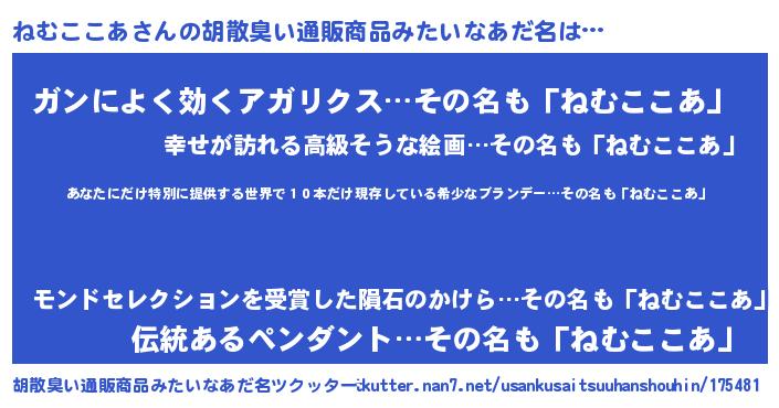| 男性向けラノベタイトル風あだ名 | 『ねむここあ~年齢イコール彼女いない歴の魔法使い~』 |