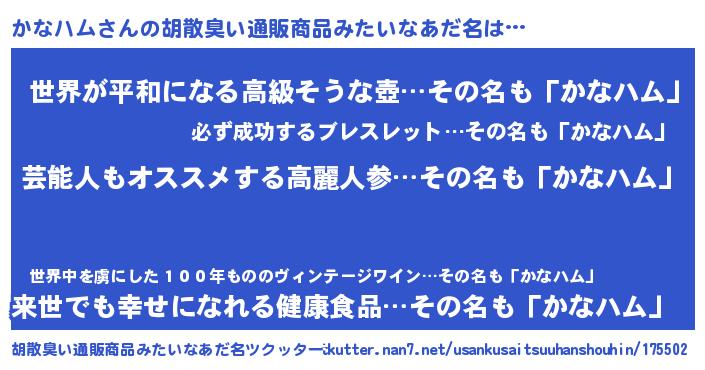 | 男性向けラノベタイトル風あだ名 | 『かなハムに滅ぼされるだけの簡単なお仕事です』 |