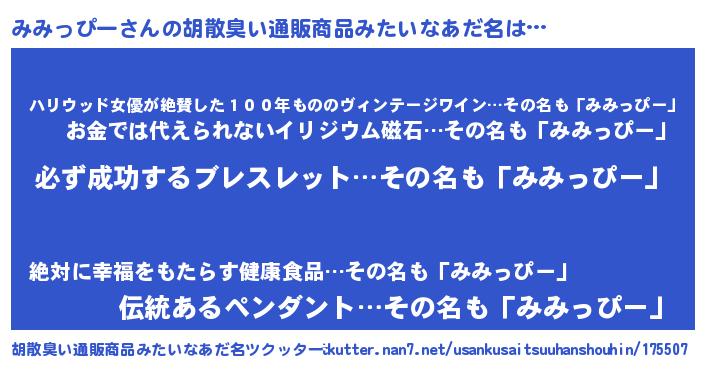 | 男性向けラノベタイトル風あだ名 | 『みみっぴーの憂鬱』 |