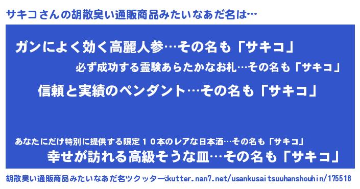 | 意味不明あだ名 | 『とにかく怪しいサキコ』『自称サキコ』 |