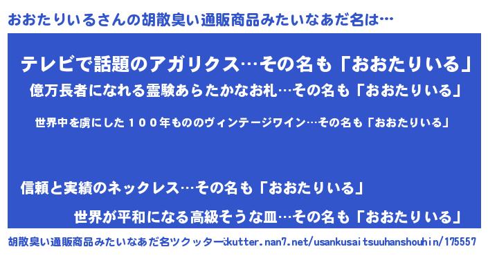 | 意味不明あだ名 | 『住所不定無職おおたりいる(13歳)』 |