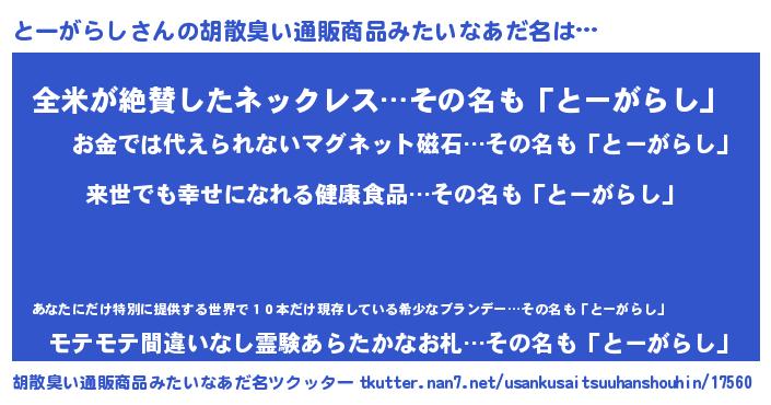 | 男性向けラノベタイトル風あだ名 | 『転生したらとーがらしだった件』 |
