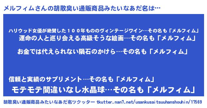 | 男性向けラノベタイトル風あだ名 | 『おまえをオタクにしてやるから、俺をメルフィムにしてくれ! 』 |