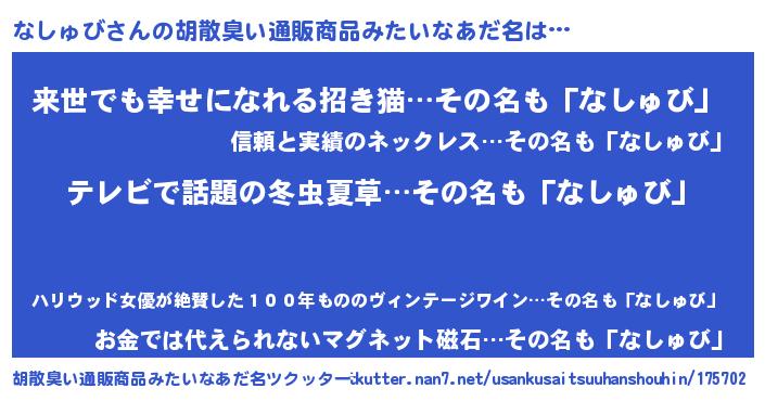 | 意味不明あだ名 | 『自称なしゅび』『永久保存なしゅび』 |