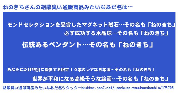| 男性向けラノベタイトル風あだ名 | 『ねのきちの嫁は女の子じゃないと思った?』 |