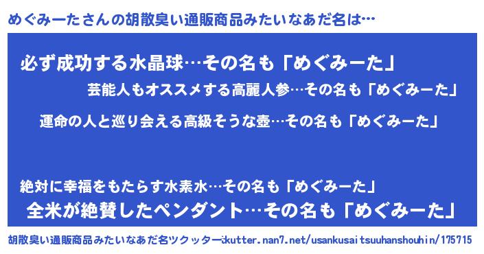 | 意味不明あだ名 | 『めぐみーたフォーエバー』 |