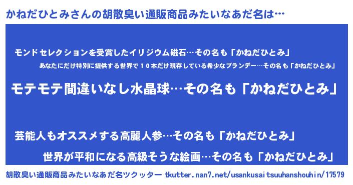 | ヘコむあだ名 | 『かねにゅー』『酢こんぶ』『かねを』 |