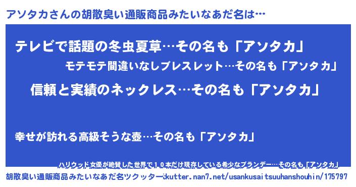 | ヒーロー風カッコイイあだ名 | 『黄金騎士アソ』『サイバー戦士アソタカ』 |