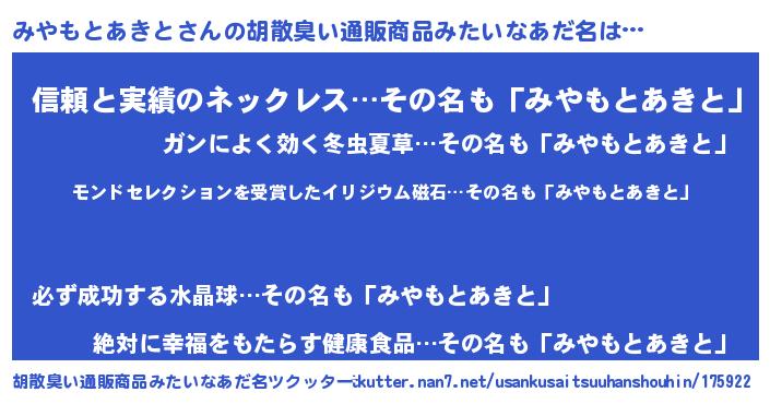 | ヘコむあだ名 | 『みやっぺ』『みやもとあきと(笑)』 |