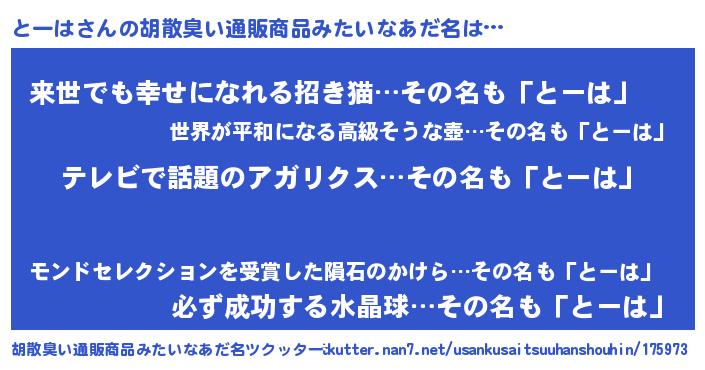 | 意味不明あだ名 | 『自称とーは』『永久保存とーは』 |