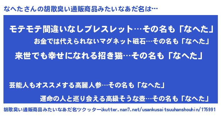 | ヘコむあだ名 | 『なへた(小並感)』『なへにー』 |