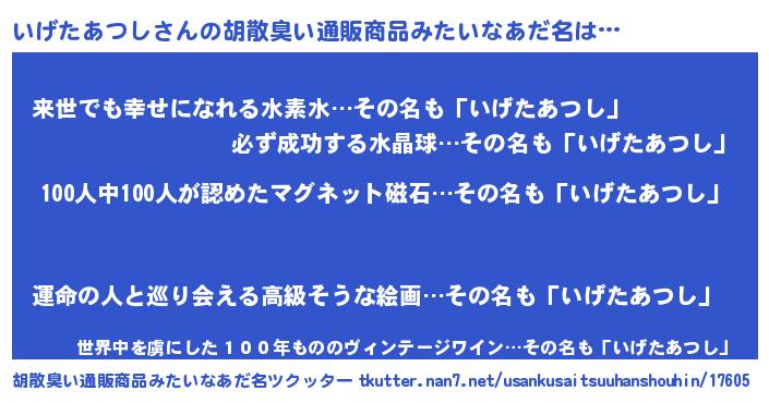 | ヘコむあだ名 | 『いげたあつし(笑)』『いげにー』 |