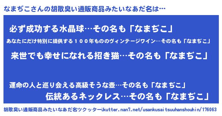 | 男性向けラノベタイトル風あだ名 | 『なまぢこという概念が存在しない退屈な世界 』 |