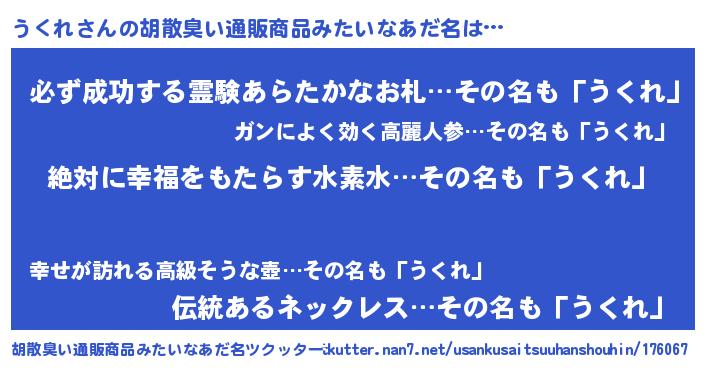 | 男性向けラノベタイトル風あだ名 | 『うくれという概念が存在しない退屈な世界 』 |