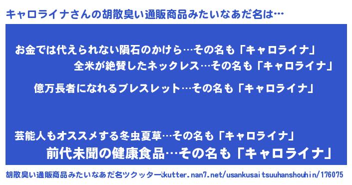 | 男性向けラノベタイトル風あだ名 | 『キャロライナ~年齢イコール彼女いない歴の魔法使い~』 |