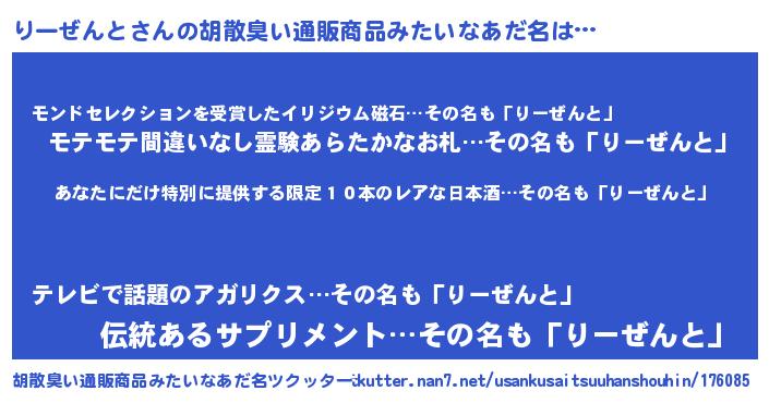 | 意味不明あだ名 | 『住所不定無職りーぜんと(41歳)』 |