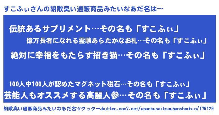 | 意味不明あだ名 | 『永久保存すこふぃ』『自称すこふぃ』 |
