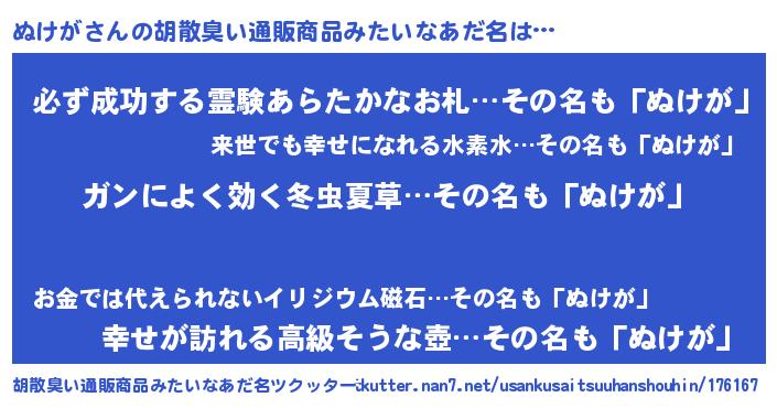 | 男性向けラノベタイトル風あだ名 | 『はたらくぬけがさま!』『ぬけがの憂鬱』 |