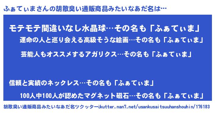 | 欧米人風あだ名 | 『ケンブリッジふぁてぃま』 |