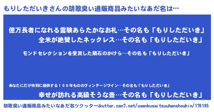 | 男性向けラノベタイトル風あだ名 | 『うちのもりしただいきが世界を掌握している!』 |