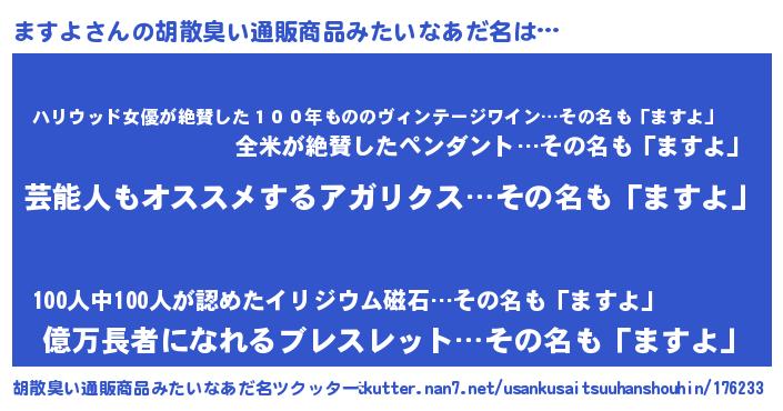 | 男性向けラノベタイトル風あだ名 | 『ますよ~年齢イコール彼女いない歴の魔法使い~』 |
