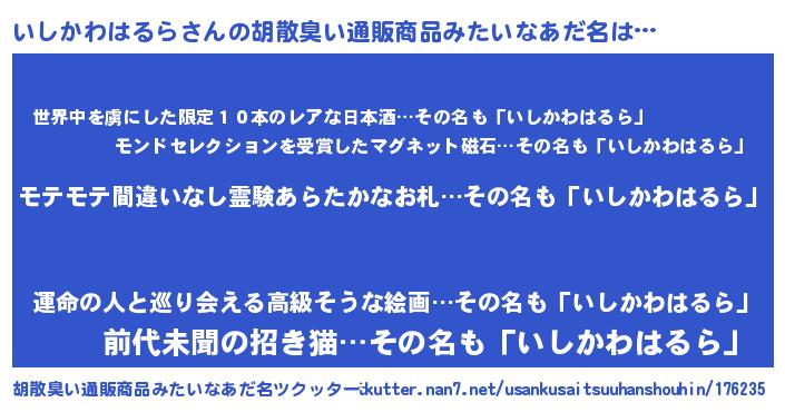 | ヘコむあだ名 | 『いしっふぃ~』『いしかわはるら(爆)』 |
