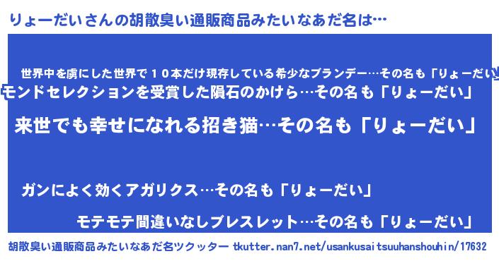 | 意味不明あだ名 | 『永久保存りょーだい』『自称りょーだい』 |