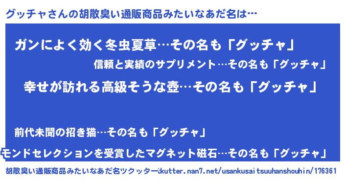 | 男性向けラノベタイトル風あだ名 | 『やはりグッチャの青春ラブコメはまちがっている 』 |