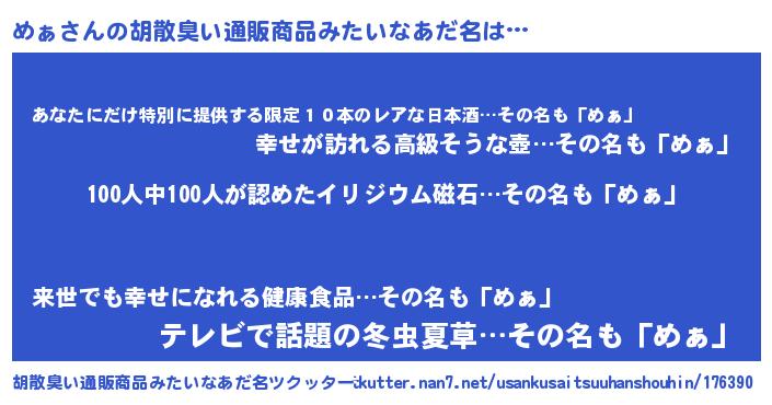 | 女子向けラノベタイトル風あだ名 | 『めぁ夫妻のなれそめ』『めぁ伯爵の花嫁』 |