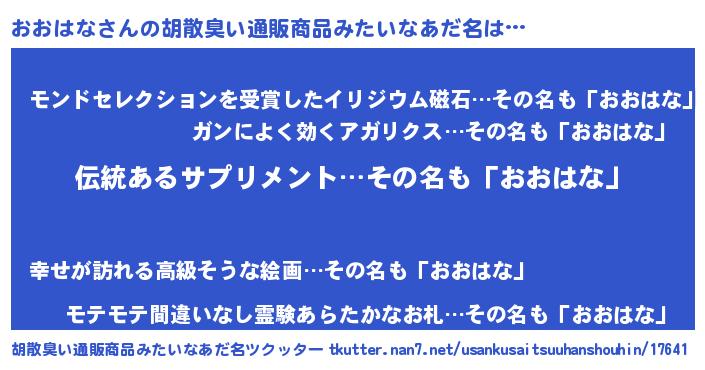 | ヒーロー風カッコイイあだ名 | 『幻影騎士オオ』『慈愛の使者おおはな』 |