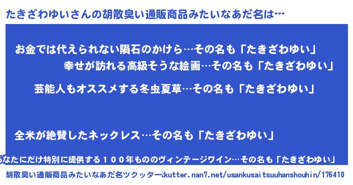 | 男性向けラノベタイトル風あだ名 | 『たきざわゆい~年齢イコール彼女いない歴の魔法使い~』 |