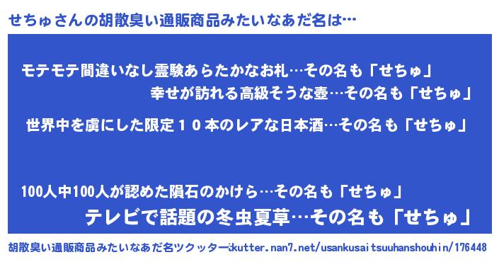 | 意味不明あだ名 | 『住所不定無職せちゅ(39歳)』『自称せちゅ』 |