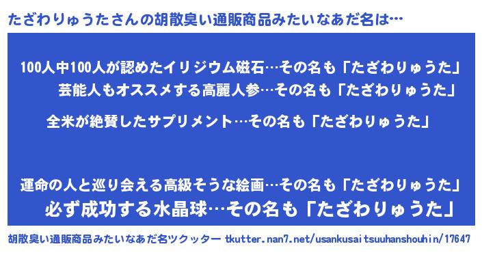 | 男性向けラノベタイトル風あだ名 | 『たざわりゅうたの嫁は女の子じゃないと思った?』 |