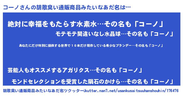 | 意味不明あだ名 | 『住所不定無職コーノ(93歳)』『自称コーノ』 |